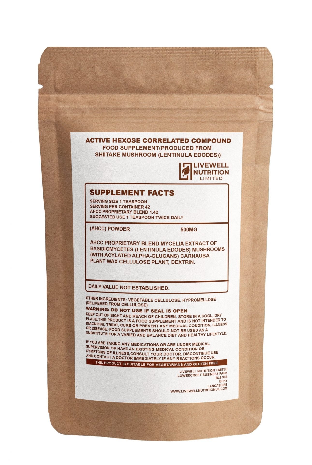 - Mycelia Extract of Basidiomycetes (Lentinula Edodes) Mushrooms: This is the primary ingredient in AHCC and is derived from the shitake mushroom. It contains bioactive compounds, including acylated alpha glucans, which have shown immune-enhancing properties. This extract supports the body's natural defence mechanisms and promotes a healthy immune system.