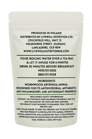 Our 20 Days Total Parasite Cleanse Tea features Organic Wormwood, a non-irradiated, GM-free herb grown organically without additives. With a rich historical background dating back to Ancient Greece, Wormwood was traditionally used for various medicinal purposes, including addressing conditions such as menstrual pains, jaundice, and rheumatism. The bitter taste of Wormwood stimulates the digestive system and contains anti-inflammatory compounds, making it an ideal choice for those seeking a natural approach to promoting digestive health and holistic wellness.